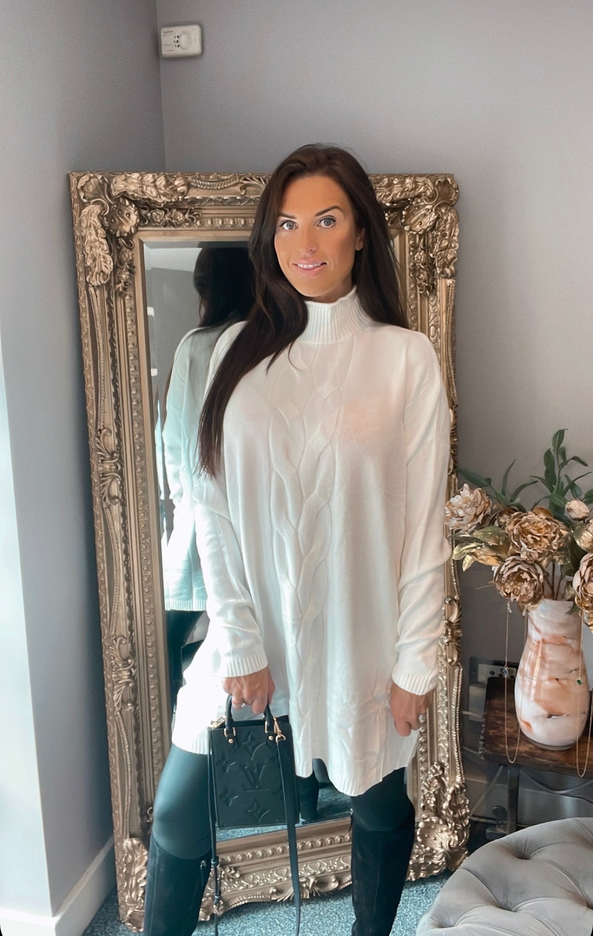 An oversized baggy knit jumper . HighThe Hailey Jumper is an oversized knit jumper, perfect for a comfortable and stylish day out. Its high neck and cable knit detail adds a classic touch, while its one size fit (6-20) ensures the perfect fit. Enjoy a timeless look and cozy feel in the Hailey Jumper.